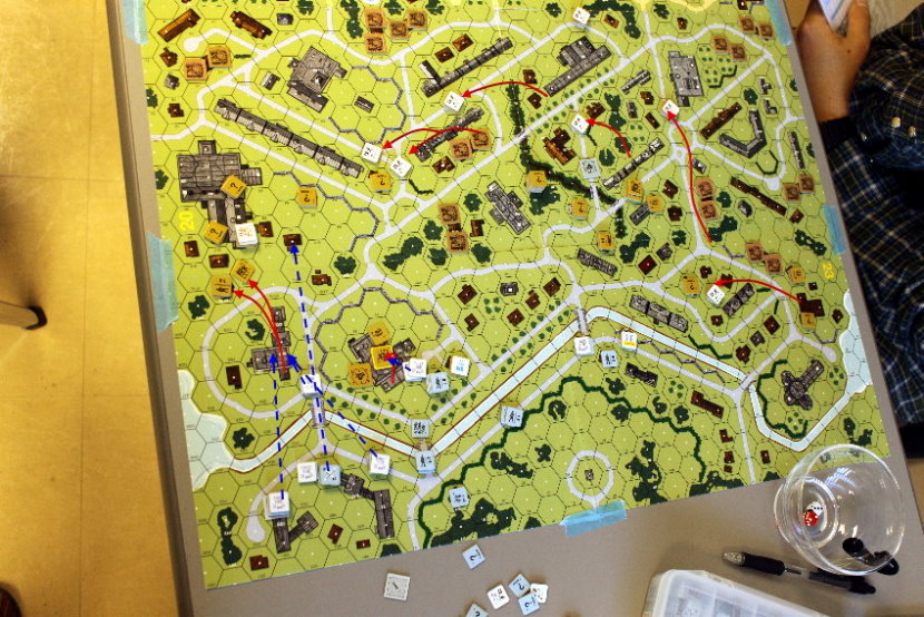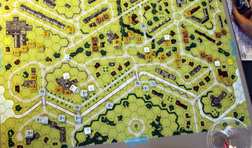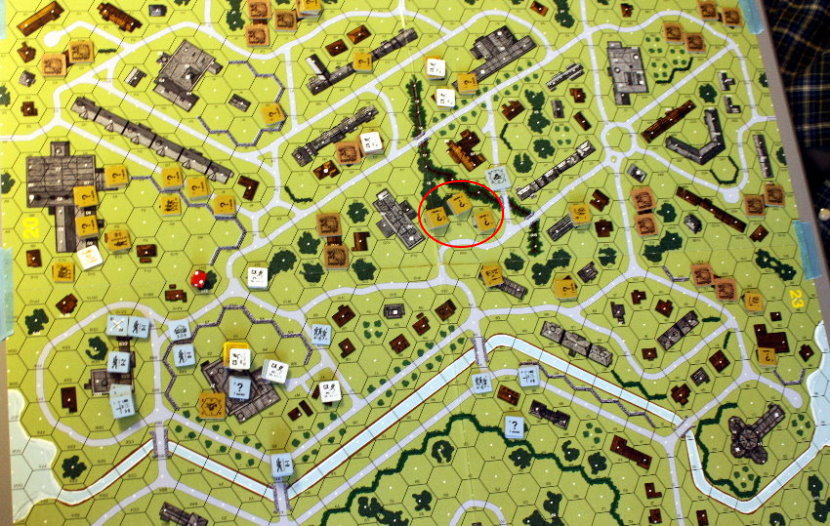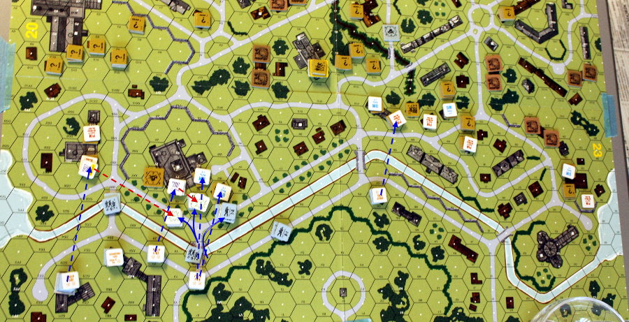 そして移動フェイズになり、2ヶ所で4-6-7が運河へ架かる橋へ前進、歩兵煙幕を試みますが、これも失敗。ふむ、上手く行かないけど、確率的にはこんなモンでしょう。