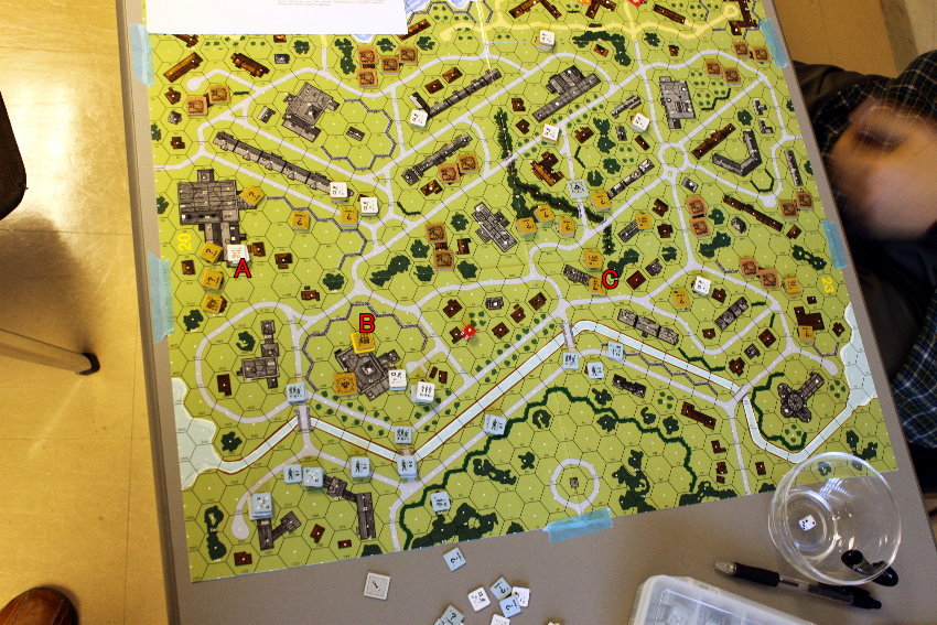 そうそう、マーカーがあり確認できなかったのですが、ソ連軍は放火を行なっていました(A)。ここに火をつけて、進入させない目論見はわかります。攻撃正面を減らしたいんですね。しかし前回の経験では、なかなか燃え広がらないんですよねぇ。