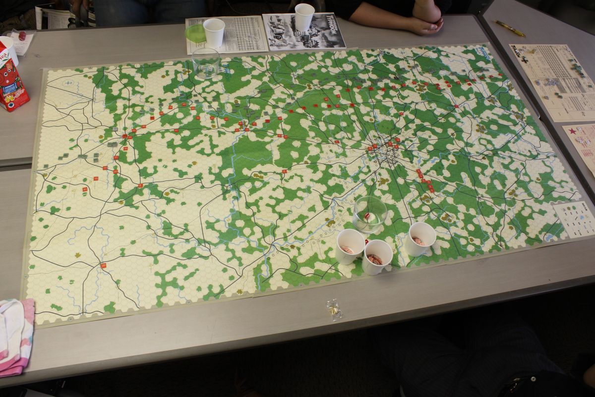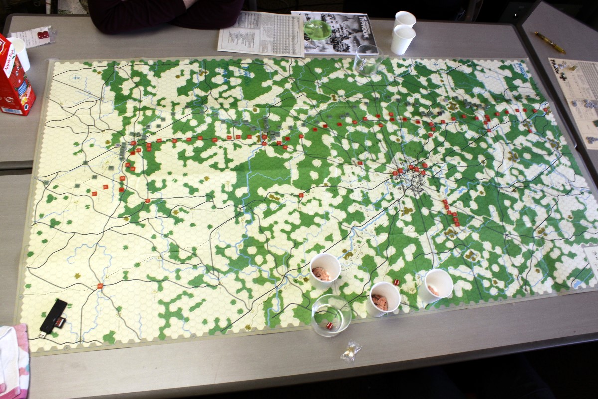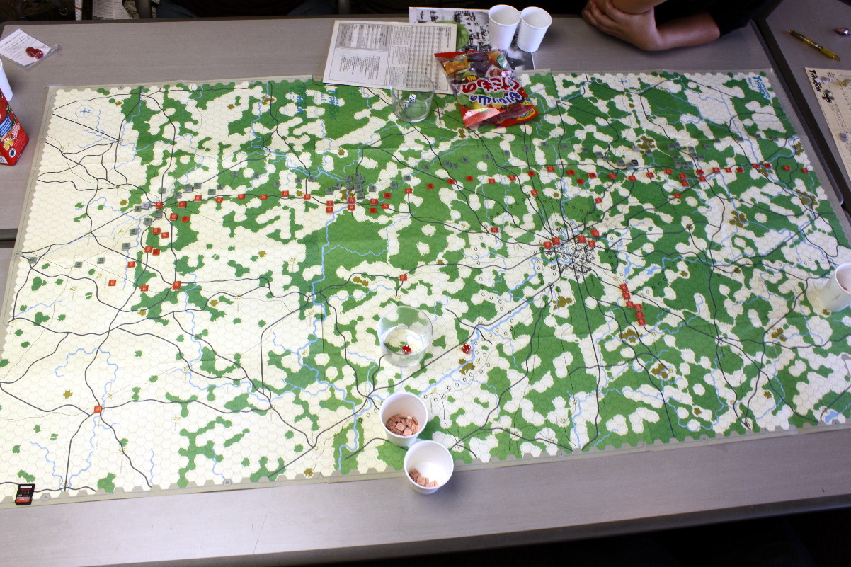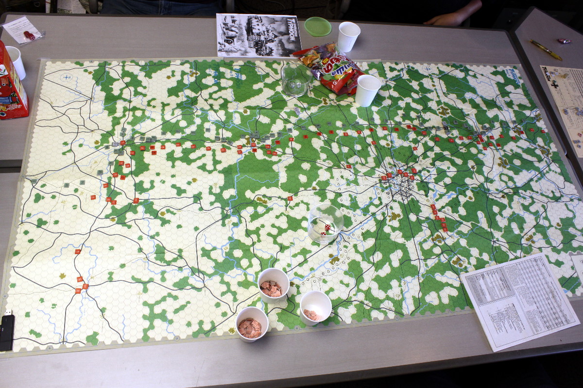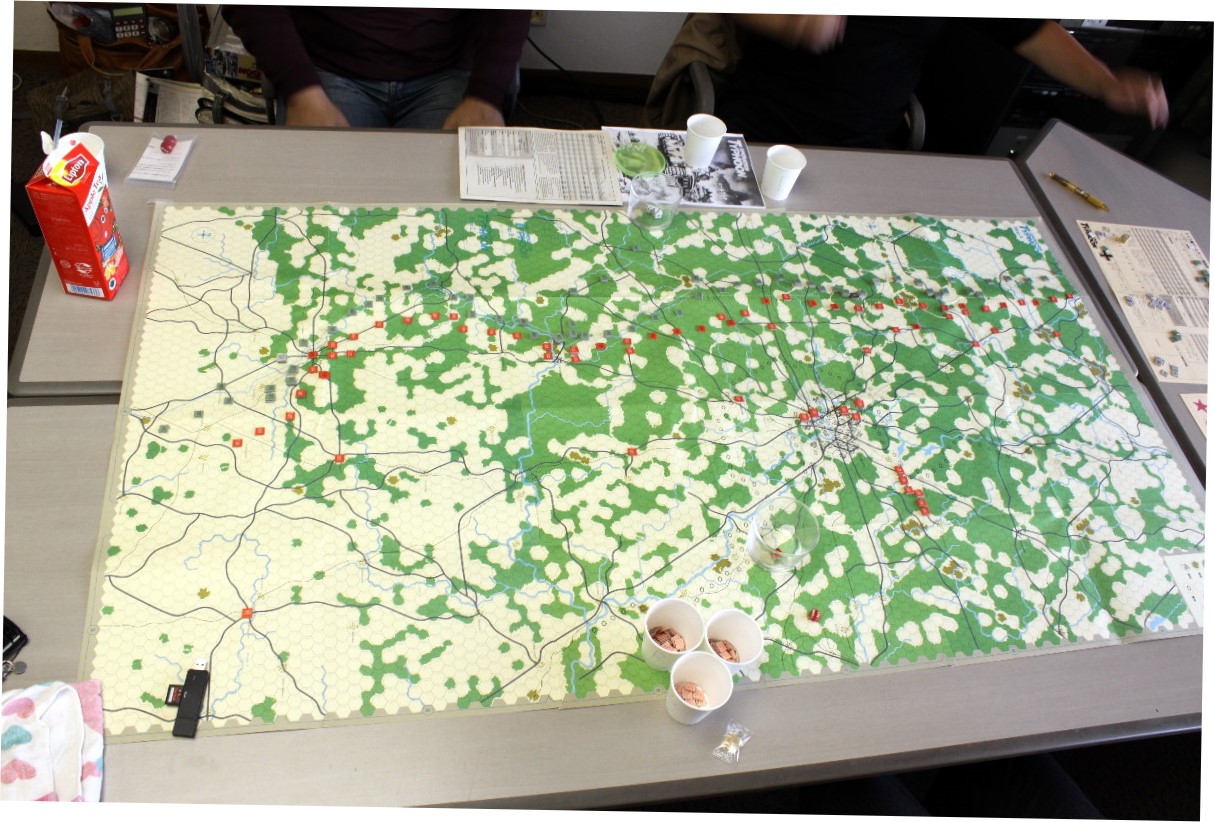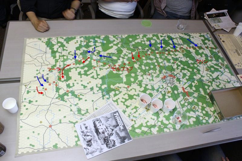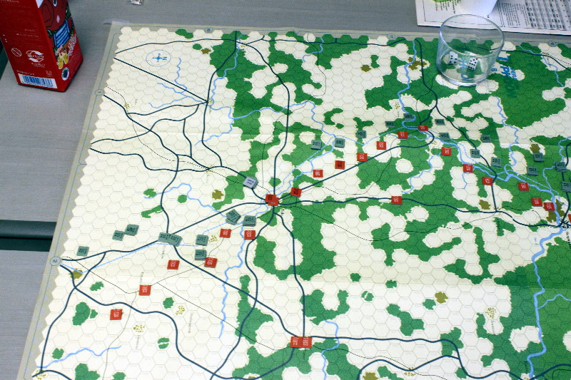 「ツーラの戦闘結果をサイコロ振って行くだけでいいのでは?」と私が言えば、「いや、続けるなら全体的に動かさないとダメだよ」と軍神殿。その言に従い、ソ連軍の前線へ攻撃を続行する。と言っても、北部は休戦状態だったが。