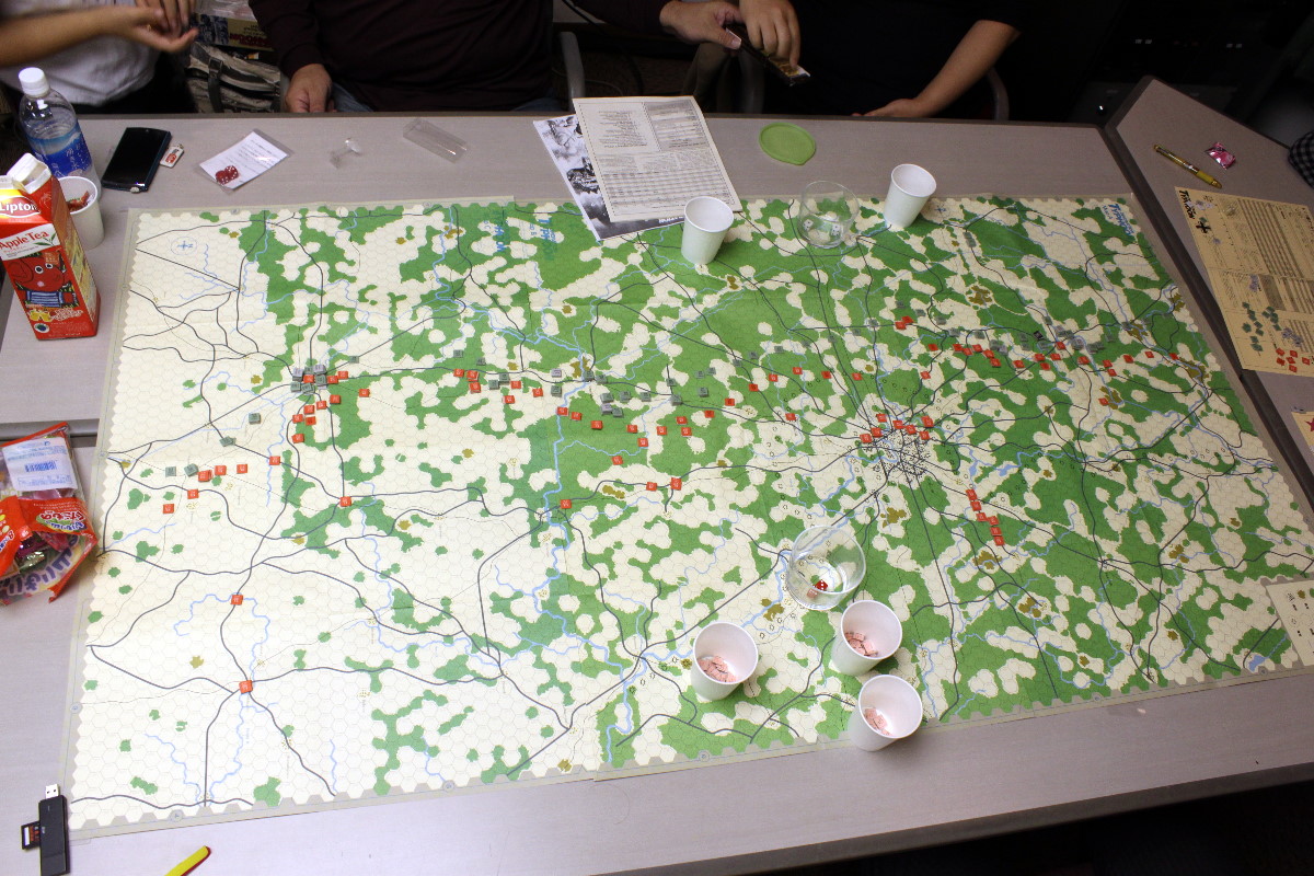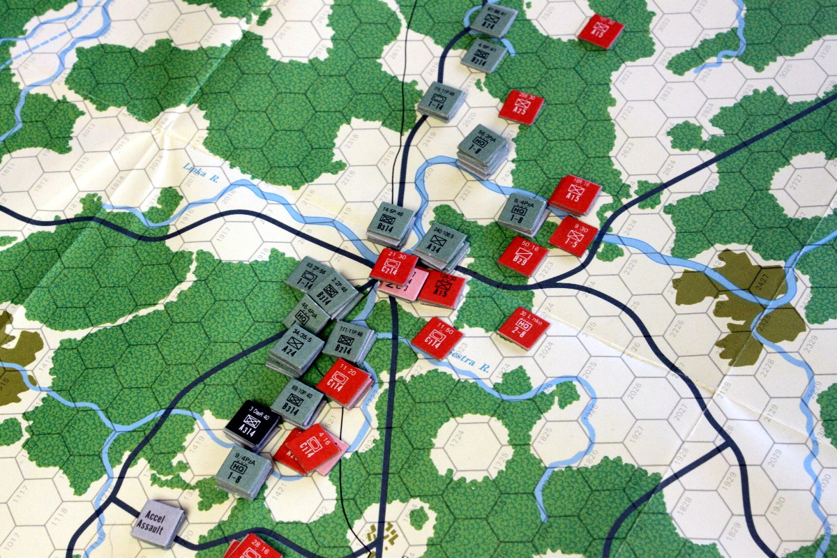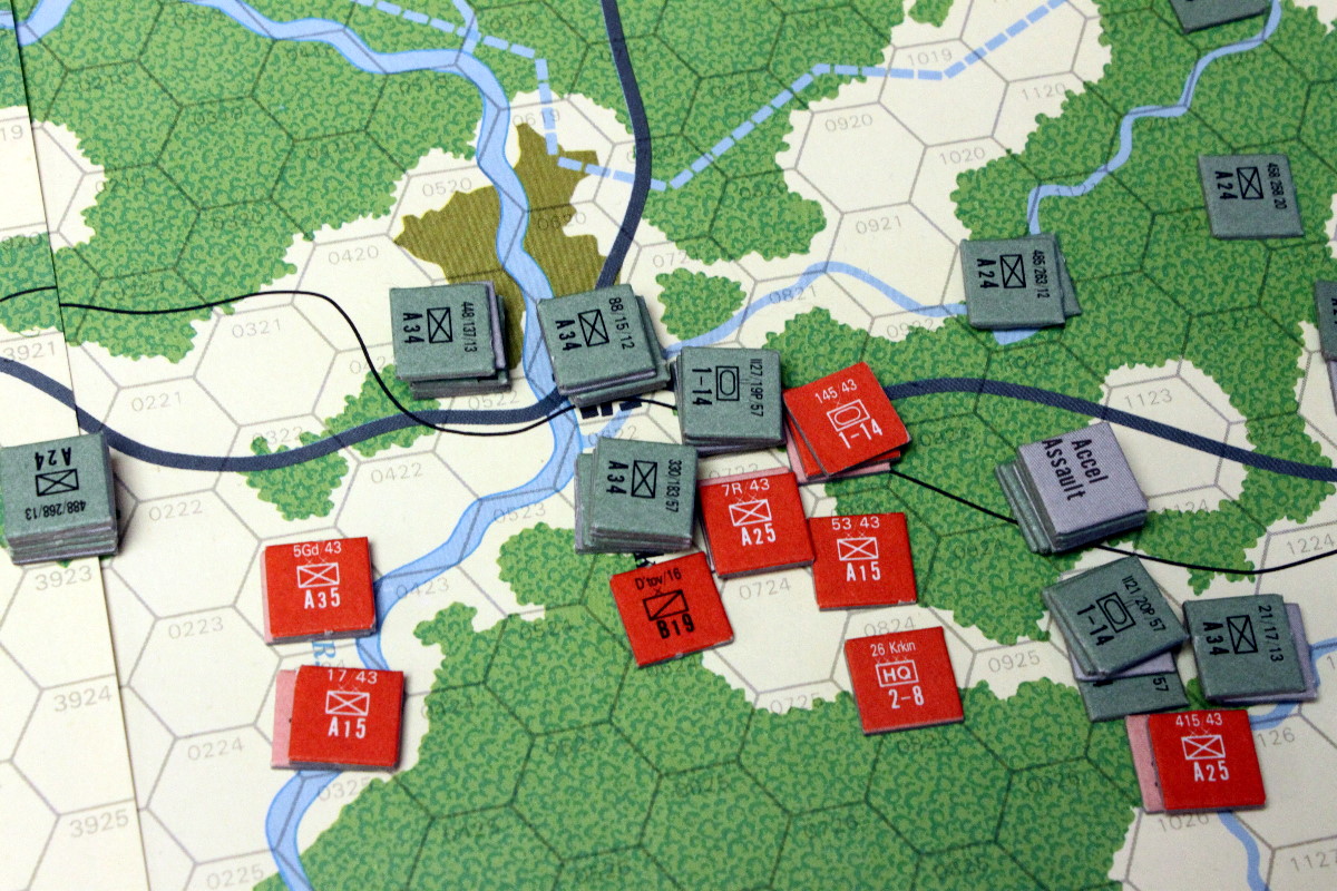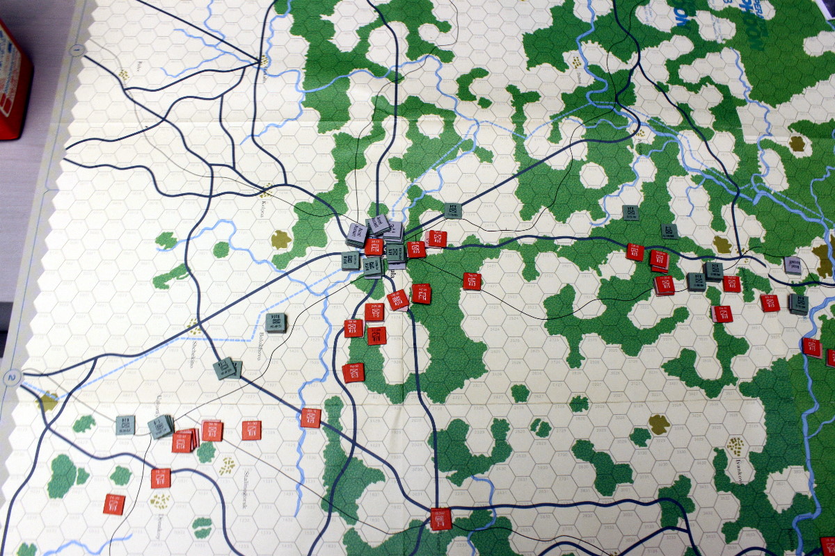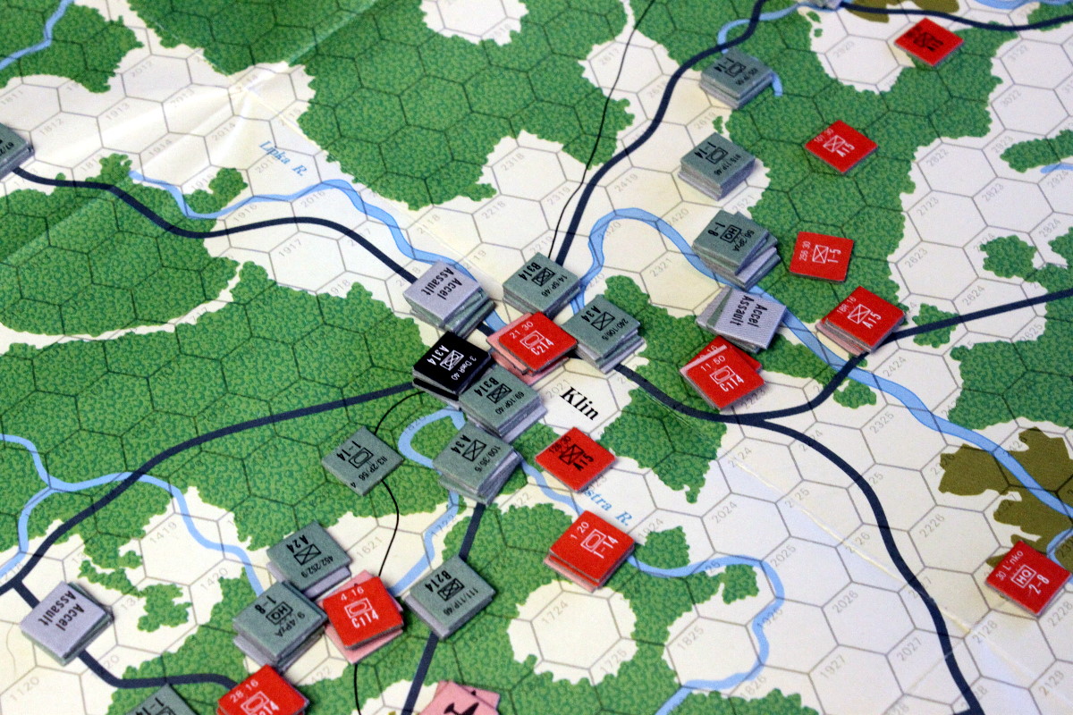そのツーラの防御態勢は、先にも述べているがソ連軍の出来得る限り強化していた。戦力は、戦車戦隊が1、A1のツーラ旅団が10、そしてA3の師団が19。合計30戦力だった。対するドイツ軍は、ここぞとばかりにアクセル・アサルトを宣言。第13軍団の所属部隊が倍の戦力となり、額面のオッズは1:1であった。それが同一師団効果で3シフト、空軍で1シフトし、最終的に都市の5:1で解決する事となった。