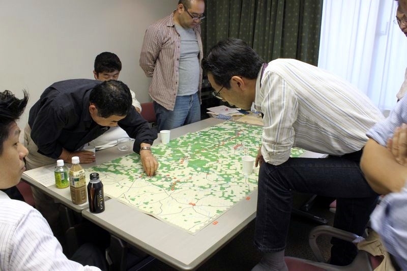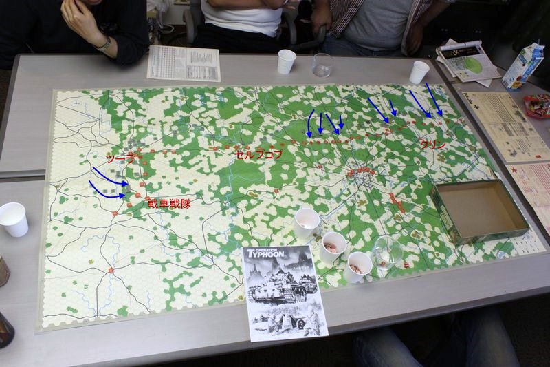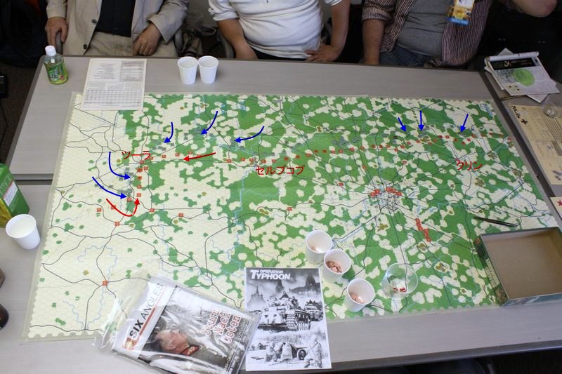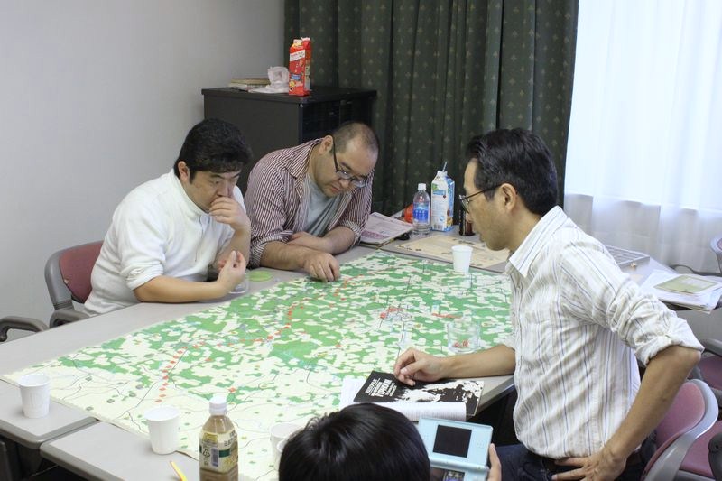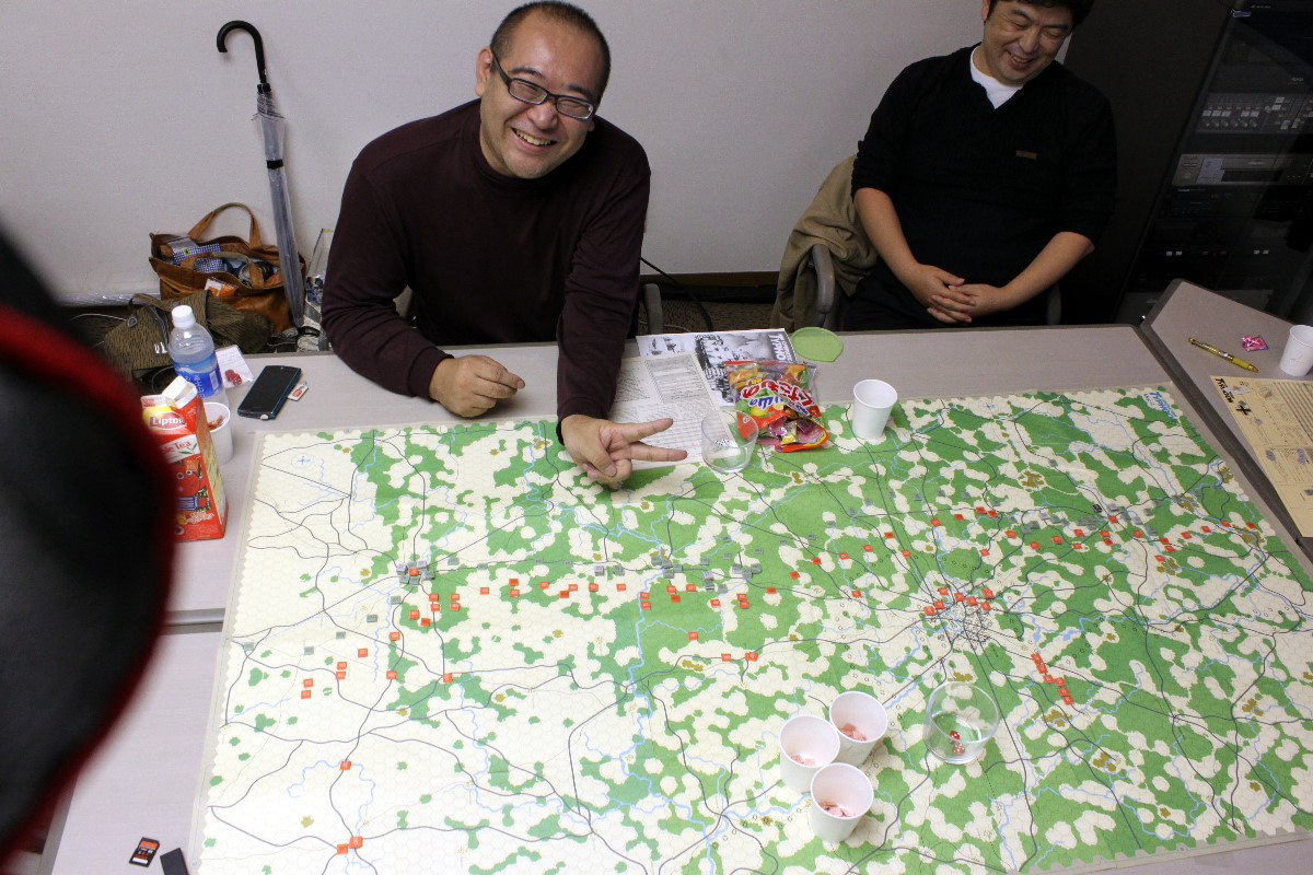 猿遊会の二日目もHJ『OPERATION TYPHOON(オペタイ)』だった。前日が不本意なまま中止したため、セットアップをやり直し、朝一から対戦を開始したのである。そのつもりで集まると、参陣を諦めていたSBさんが現れる。強力なK-ZOCを地道な交渉で突破したのである。これは正に万難を排したと言っていい快挙であった。これには皆が歓声を上げて歓迎し、この合計5名で対戦となった。では、飽きずにメンツと担当の紹介をする。