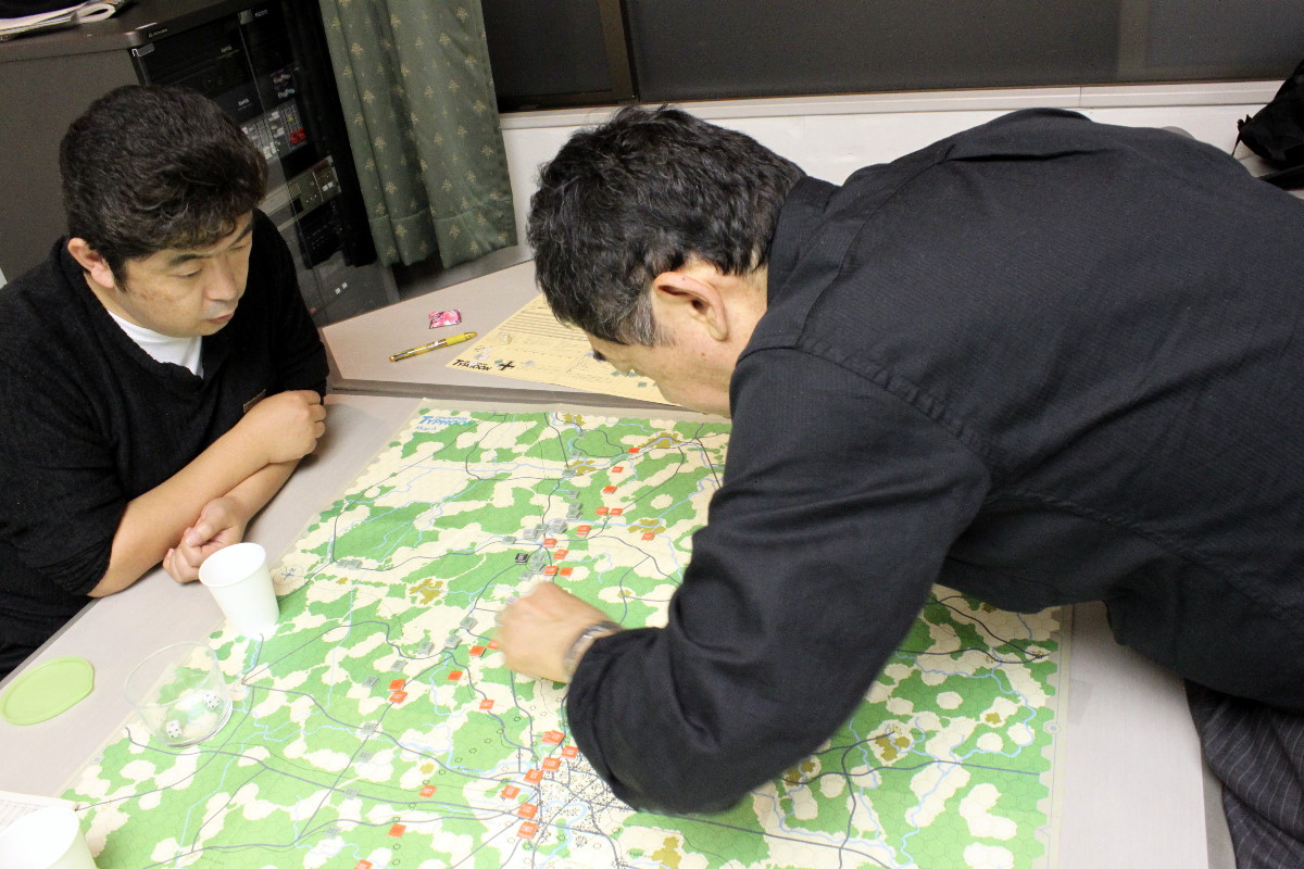 個人的には、オペタイがビッグゲームとは言えないと思っている。何せ、AH『THE LONGEST DAY』は基準であるのだから。しかし、オペタイでも結構な広さがあり、マップの中央を動かすのは手間がかかる。下手に手を突いたらマップがずれて、戦線が物理的に崩壊する危険が高いのだ。そこで私は椅子に脚を置き、身を乗り出すようにしていた。態度は悪いのであるが。右の写真が普通にユニットを動かしている状況。この体勢は腰に来るのである。隣のSBさんが拳をついているが、このはちょっと危険。