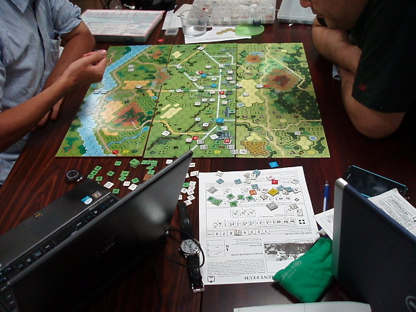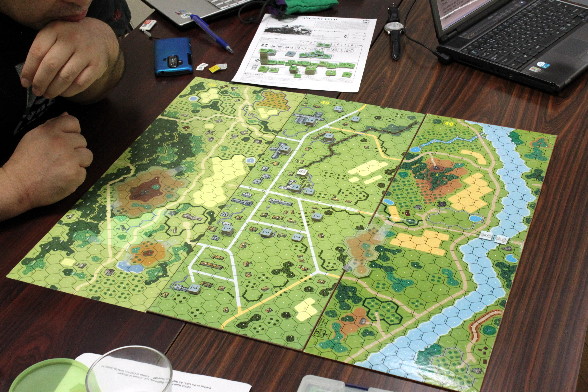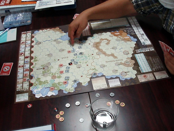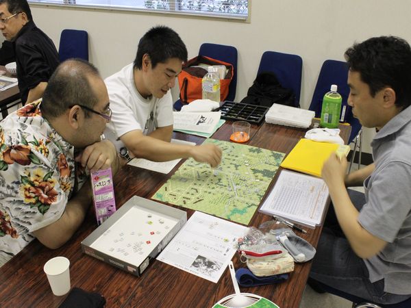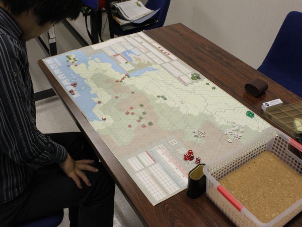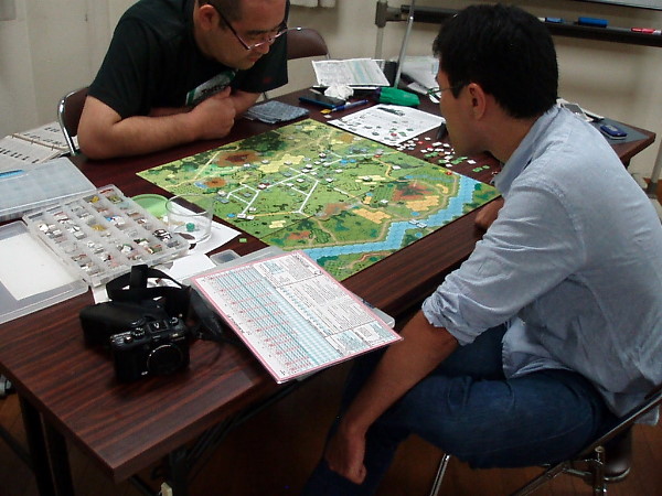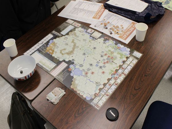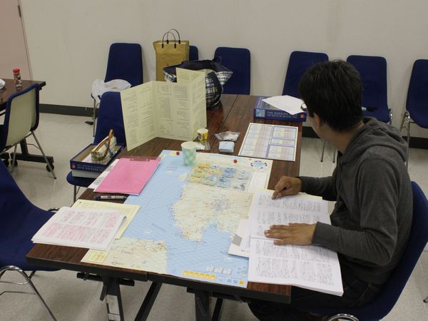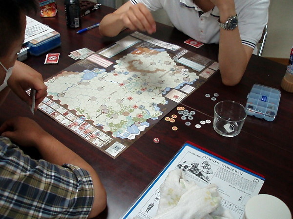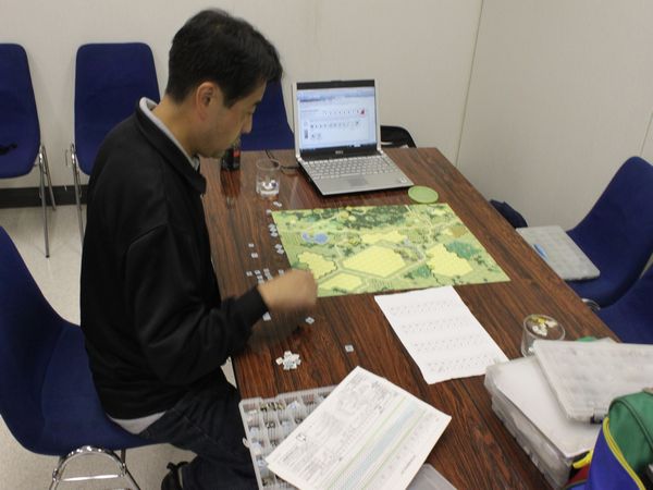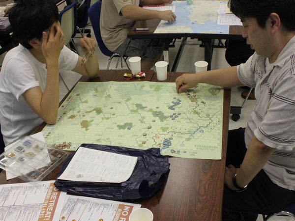 そこで『NO RETREAT!』を広げて、「1ターンにドイツ軍が“参謀本部”を使い、戦闘後前進を1ヘクス余分にできたら」という課題で話し合いをしたのです。
