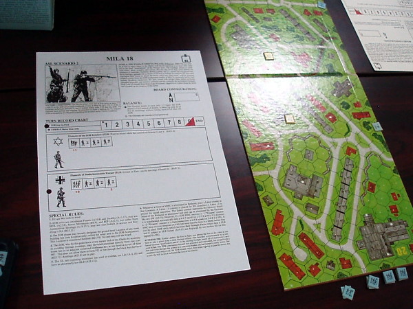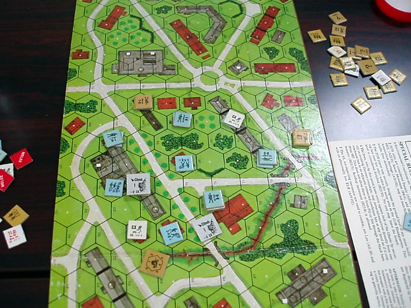 ミスと言っても、ほんの僅かなもの。軍神殿はコマンドマガジン99号の記事に書かれていたように、「攻撃しないギャンビット」を展開。すると、1ターンのソ連軍の手元に“レッドオーケストラ”と“泥将軍”が来ていました。攻撃しないギャンビットを“泥将軍”で足止めすれば、ドイツ軍の前進速度は大いに鈍ります。