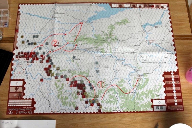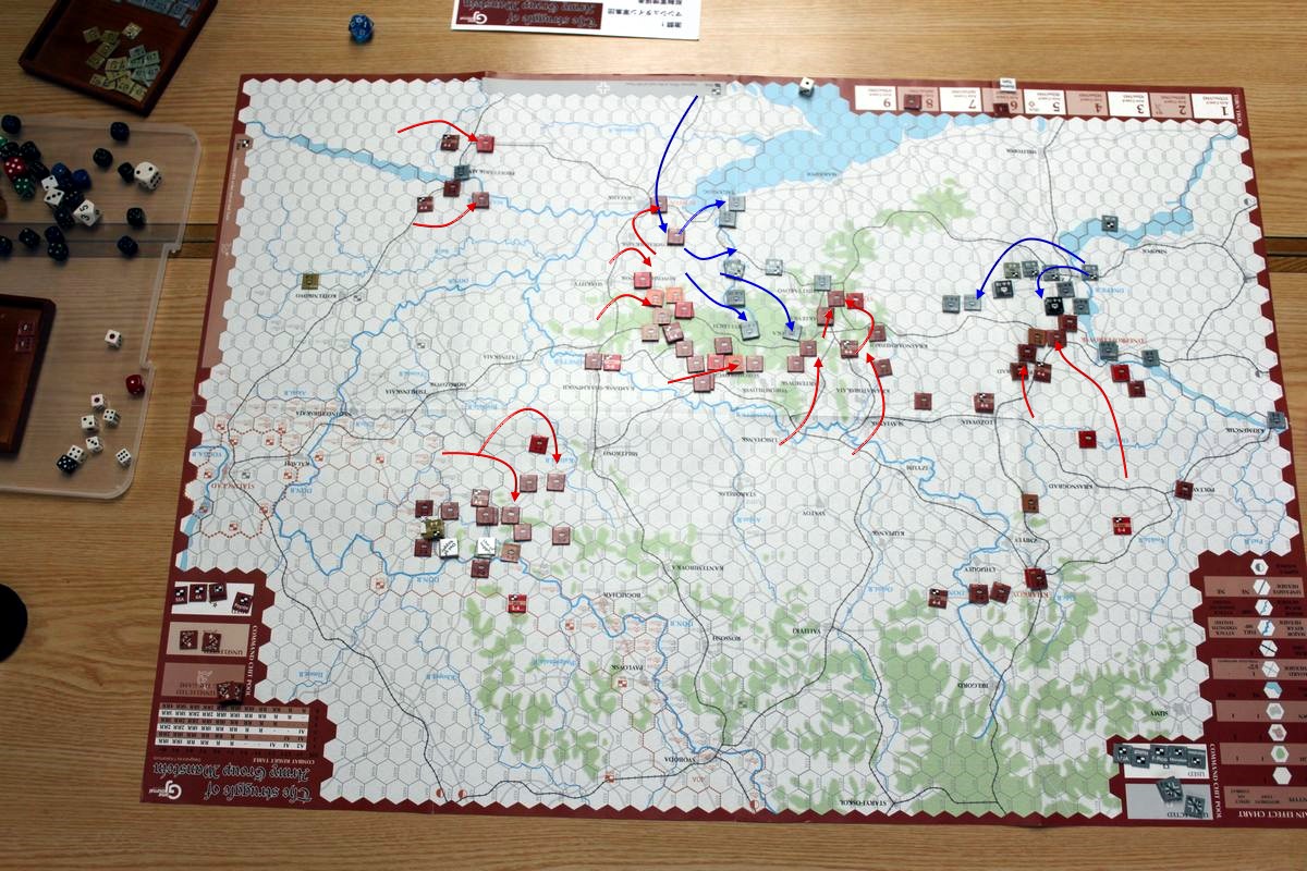 まず、 (①、写真は南北が逆転しています)北部でラッシュを仕掛け。H2Aを壊滅させます。一旦、矢印が大回りになっているのは、このゲームの戦闘結果によります。