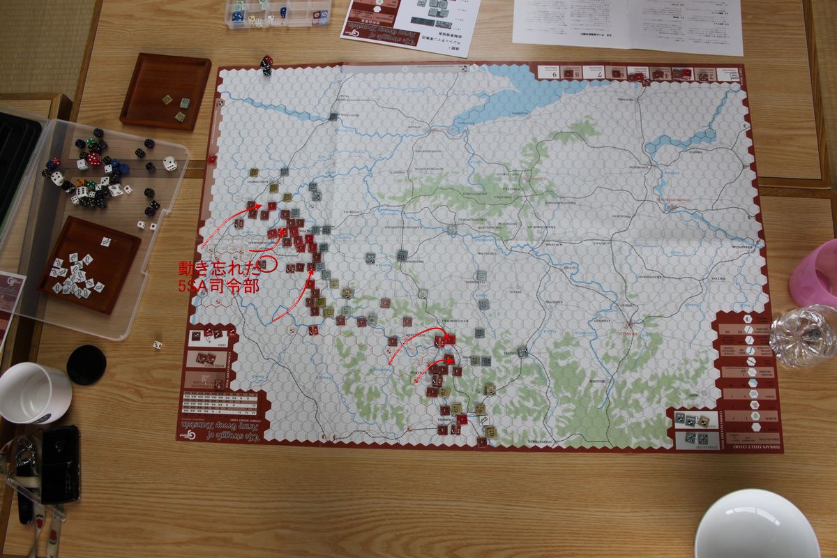 1ターン終了時点では、ソ連軍の部隊は5SAの指揮範囲ギリギリまで進出していたのです。コンボを組む2GAはその先でした。当初の予定通りに、この状態で2GAが活性化してしまうと、多くの部隊が5SA司令部を置いて前進してしまいます。で、その後に5SAが活性化すると、指揮範囲には誰もいない、と(´・ω・`)。