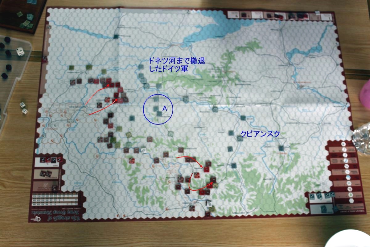 これはですね。ドイツ軍がソ連軍の補給源を狙って突進することなんです。実は、このゲームでソ連軍は補給源が3ヶ所(実質的に2ヶ所)しかないんですね。それをドイツ軍に押さえられてしまうと、ソ連軍の皆さんは丸ごと補給切れ=孤立。そうなると、移動力も戦闘力も半減します。まあ、これが成り立った時点で、ソ連軍の投了決定ですね。はっきり言って。