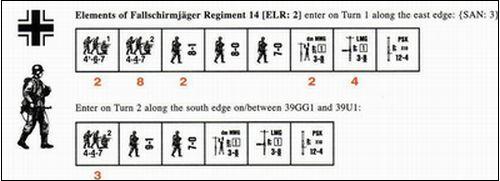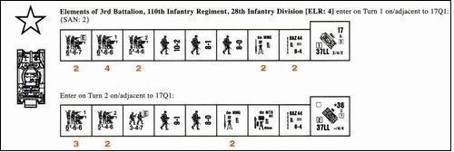 1ターンの裏にアメリカ軍の先陣である10個分隊がマップの中央上部“B”のヘクス列から進入して来ます。2ターンの裏に後続が同じ“B”ヘクス列から5個分隊が現れます。上の図で、それぞれ「Turn1」と「Turn2」とあるので分かるでしょう。