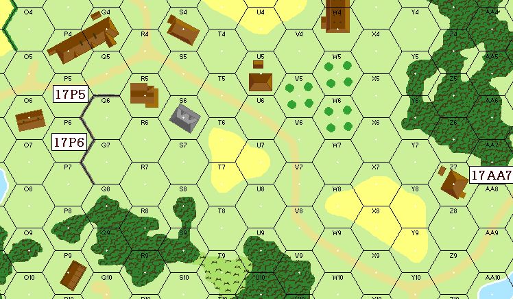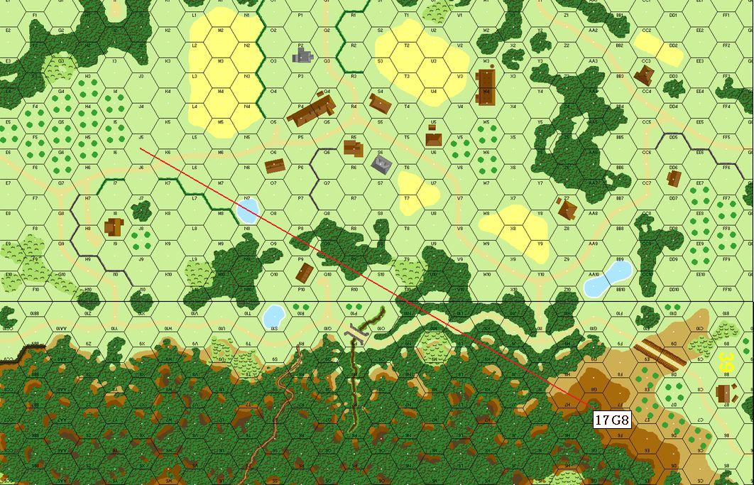 しかし、この移動には17Z7からドイツ軍の射撃を受ける危険があります。このヘクスを含めた周辺ではは勝敗に絡むため、線は引きません。何故なら、それによりLOSの確認、までは行かないものの、判断が出来るからです。これはルール的に「事前にLOSの確認はできない」に触れる事は厳密にはありませんが。ASLのマナー的に如何なものかと思うのです。ちなみに、これまで私が線を引いているのは、ASLをプレイしている人間なら、誰でも分かるようなモノです。本題へ戻ります。