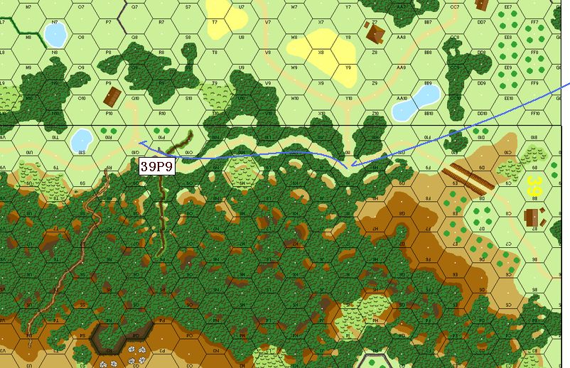 もう1つは、アメリカ軍の最優秀な10-2指揮官が、スタックで突っ走り17P8まで進出するのです。指揮官とスタックすれば、8移動力を発揮でき、突撃フェイズも入れれば、17P8まで達するため十分に可能です。このヘクスはちょうど39P8へLOSがあるため、ドイツ軍は他の経路を選択せざるを得なくなります。
