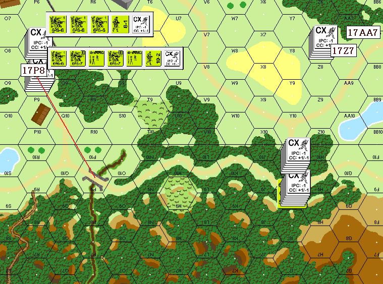 しかし、17AA7は危険です。ここからLOSが通ると、8-1指揮官の投入で、+修正は無くなります。さらに機関銃を1個加えたら、6火力の修正無し。ちょっと厄介です。