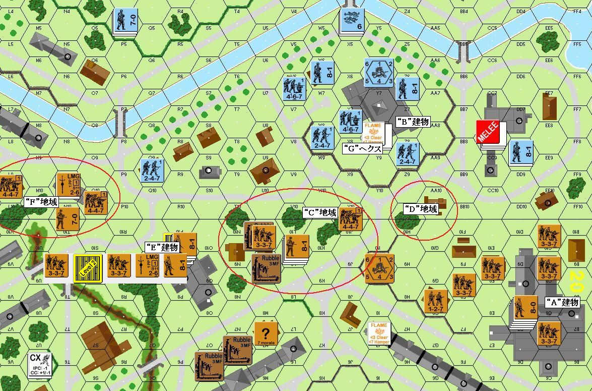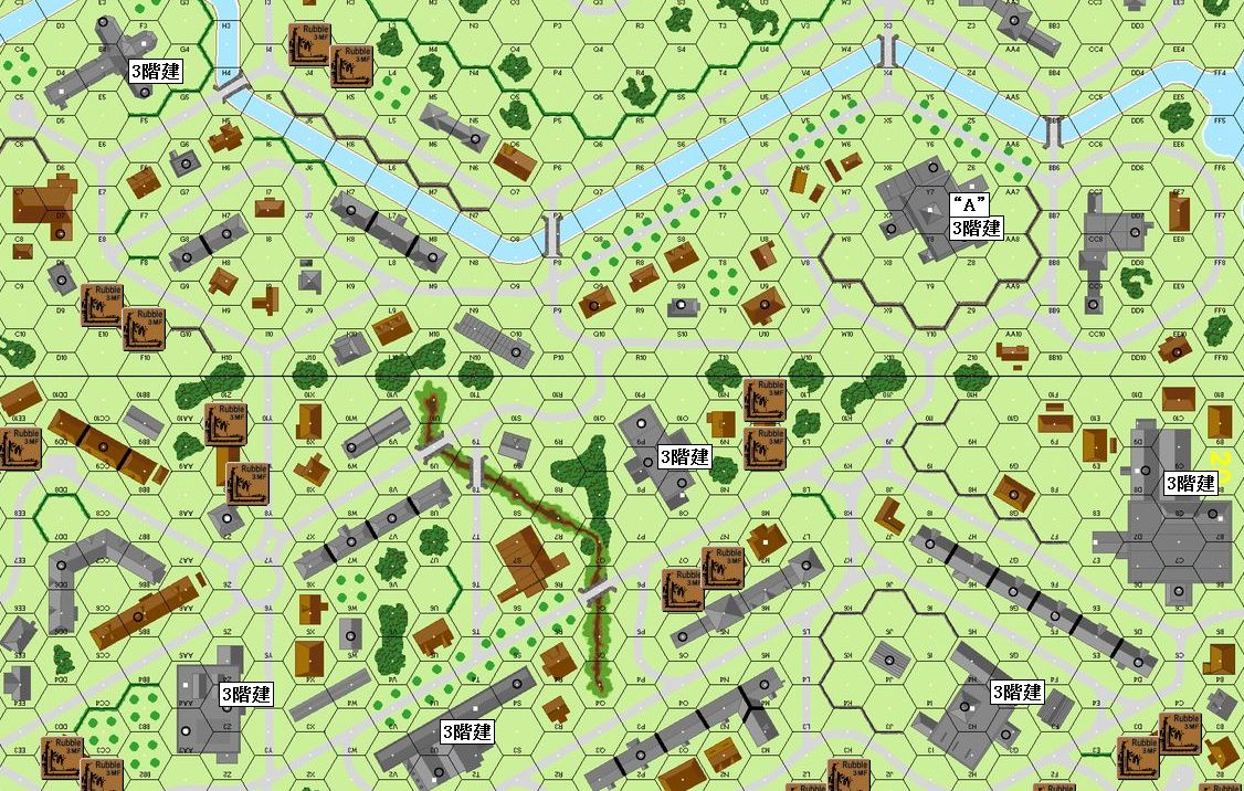 特に、運河付近にある“A”の建物は、ソ連軍を制圧するのに大変有効な3階建てです。ここが序盤に於ける戦闘の焦点になると考えました。