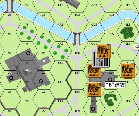 では、“A”建物からドイツ軍が攻撃態勢を整えるのは、3ターン以降であれば、ソ連軍は新たなる防御態勢を整えられている。もしくは、整える寸前になる。だから、“A”建物は2ターンまで粘り、兵力を損なわないように、順次撤退する。そうすれば、“A”建物からドイツ軍が進出出来るようになるのは、4~5ターンになる。いくら早くても3ターンだ。