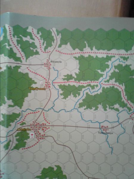 で、コマンドマガジンの付録のマップは、それまでと違い陣地の表示が、三角を並べるというのでなく、ヘクスの外輪を黄色にしていて、カッコ(・∀・)イイ…。