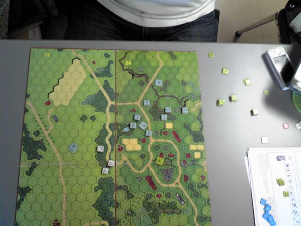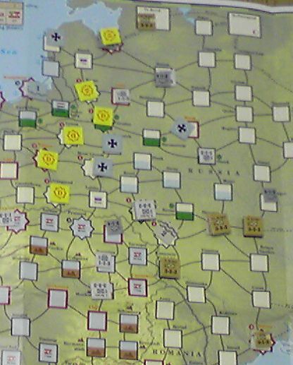 ロシア軍の生き残りも、ドイツ軍の補給を切断出来る地点まで進出させました。完全に補給切れにするには、部隊数が足りないため有り得ないのですが、こうやってCPに手間をかけさせ手番を稼ぐのです。