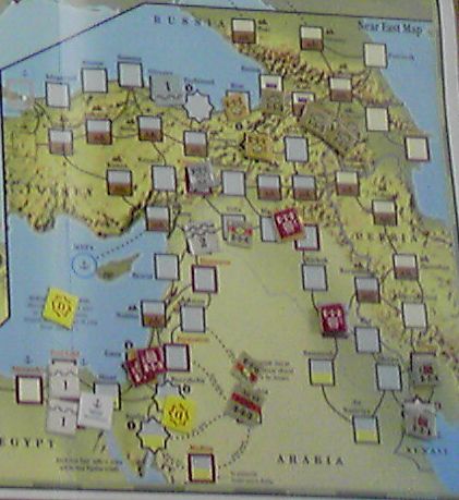 ターンが始まった当初、マップにあるトラックでVPを確認し、自分の勝利を確信していました。現状、7VPでエルサレムとメディナを失っても、BLOCKADEで1VP返るから、と。だから、近東で西南のモスルは仕方ないにしろ、バグダッド以南を維持しておけば問題ありません。