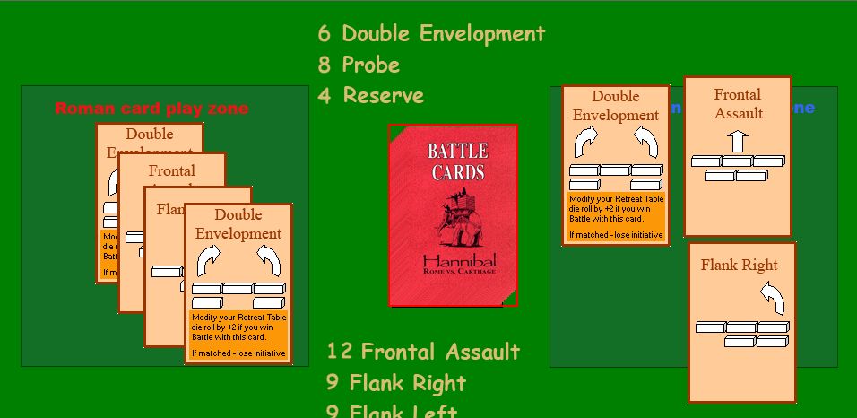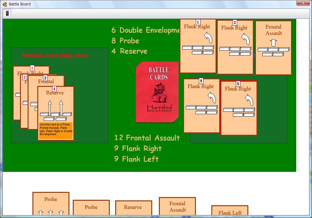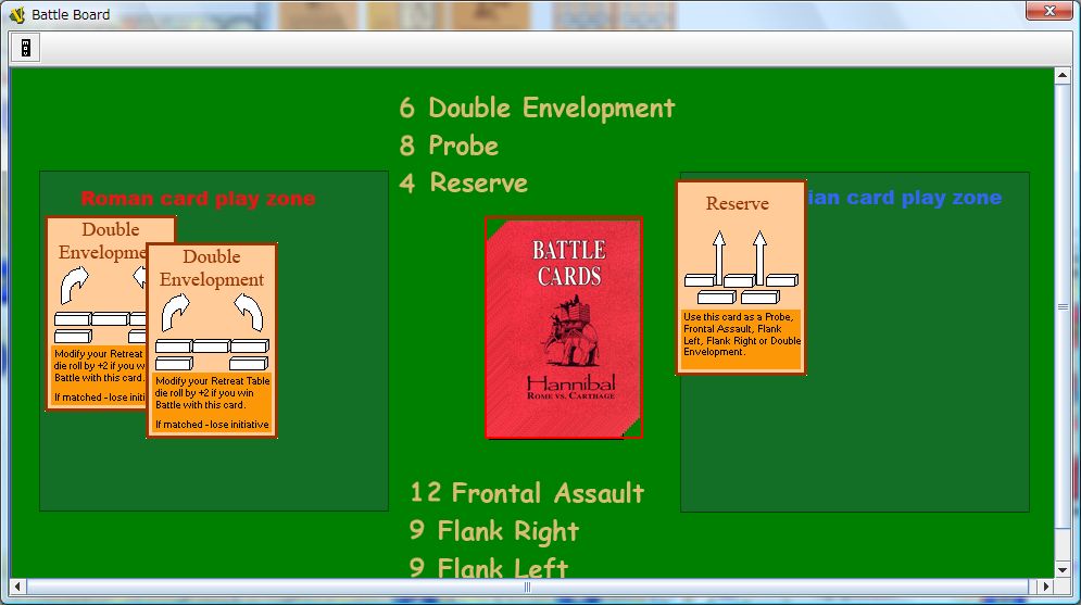 そしてアフリカヌスは探りを出すと、ハンニバルは対抗手段がなく、この会戦の敗北が決まってしまった。探りはハンニバルの特殊能力を発揮できるカードであるが、探りは他から変えようがないのだ。