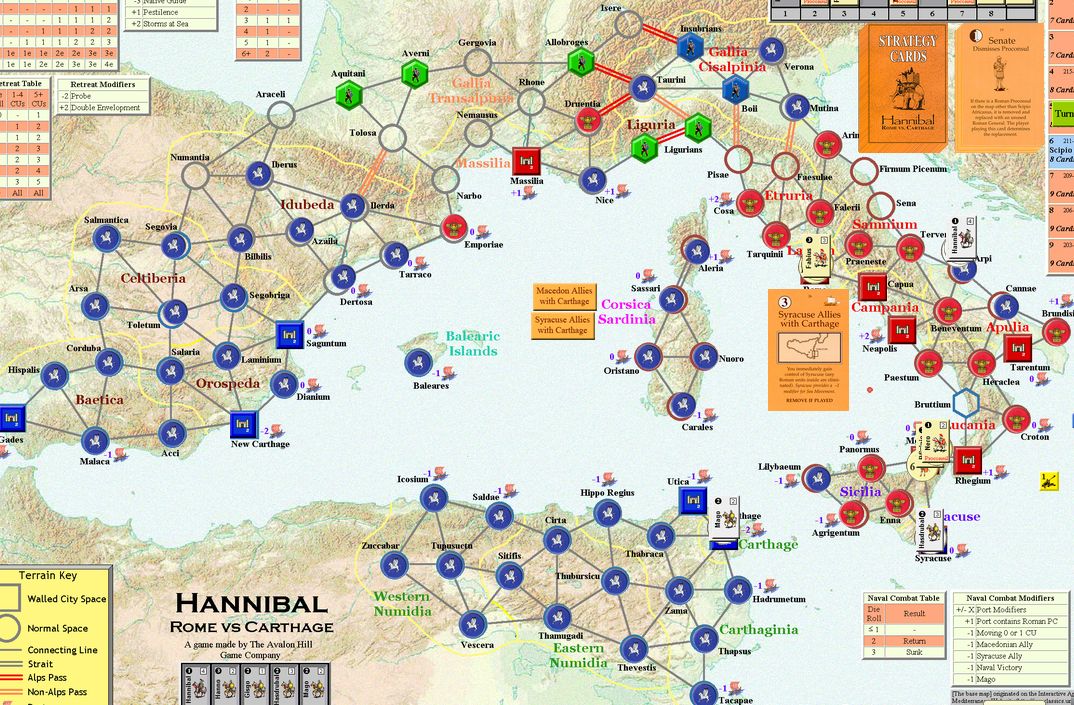 「現地のガイド」は山越えのリスクを軽減するものだ。これでハンニバルの泣き処であるアルプス越えで損害を減らせる。「オラはローマが敵だっぺよ(千葉弁の意訳)」はイタリアでの行動で大きな影響をもたらす。「アドリア海賊」は3CUをイタリア南部の港湾へ送るんだけど。僅か3CUだしなー。「セルチベリア反乱」は自分の支配を崩されないから嬉しい。「カルタゴの攻城兵器」も使えないんじゃないかなー。今更ハンニバルが攻囲をするとは思えないし。でも3OPカードだからいいけど。「マイナー・キャンペーン」は2人の将軍を一辺に動かすことはなかろうが、それでも3OPカードだからねぇ。「疫病」をアフリカヌスにお見舞いするかな。ウヒヒ。