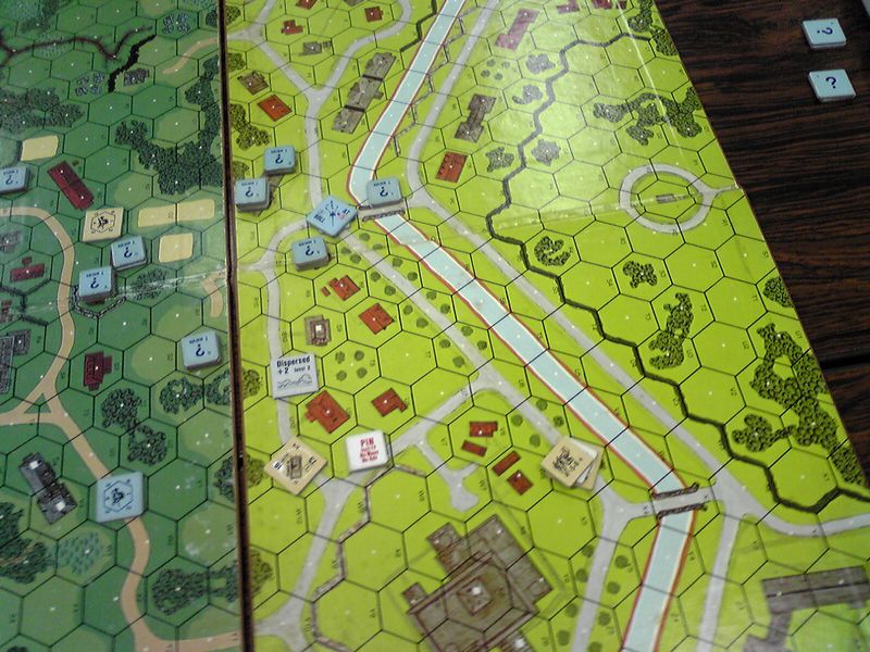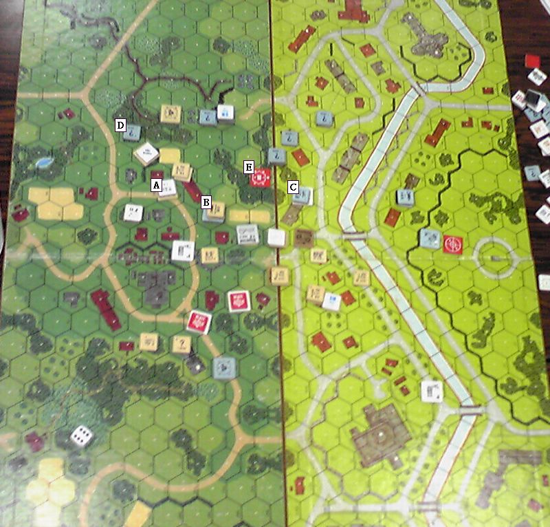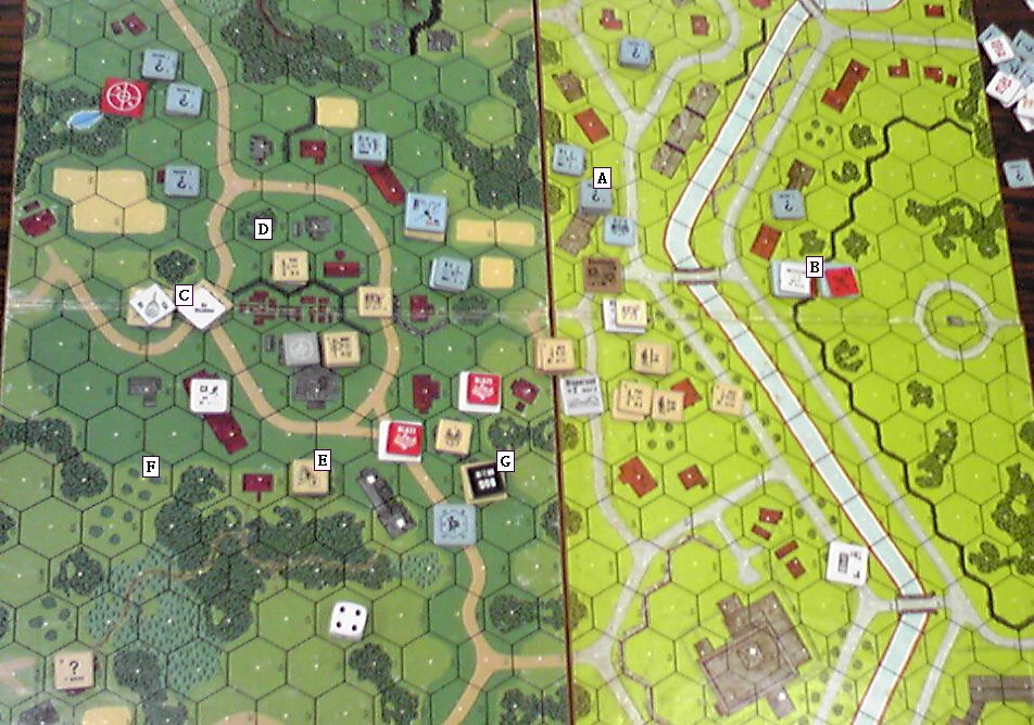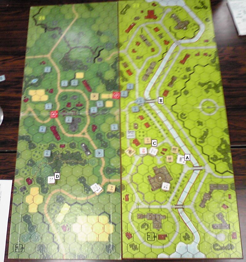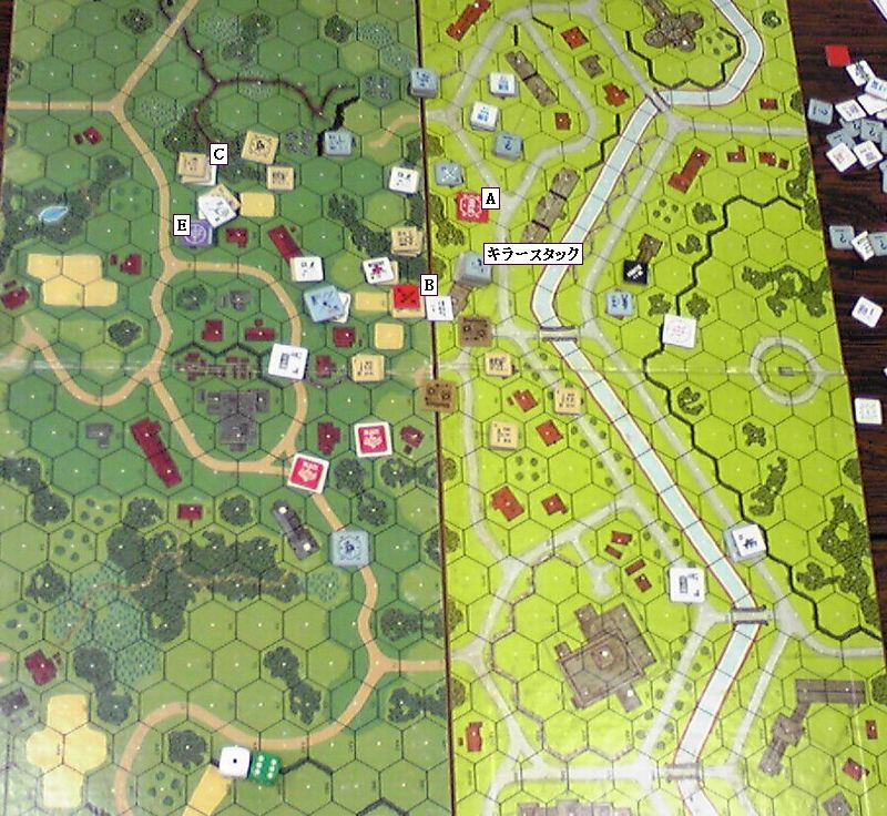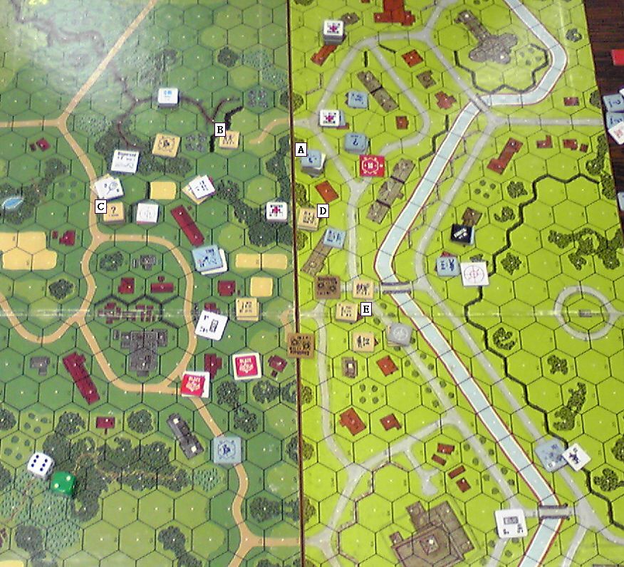 運河沿いはOBA待ち。ドイツ軍の高いスタックがあり(A)、これが危なくて進めません。ちなみに、この前のヘクスにあった88は「お役ゴメン」とドイツ軍が自ら破壊しました。